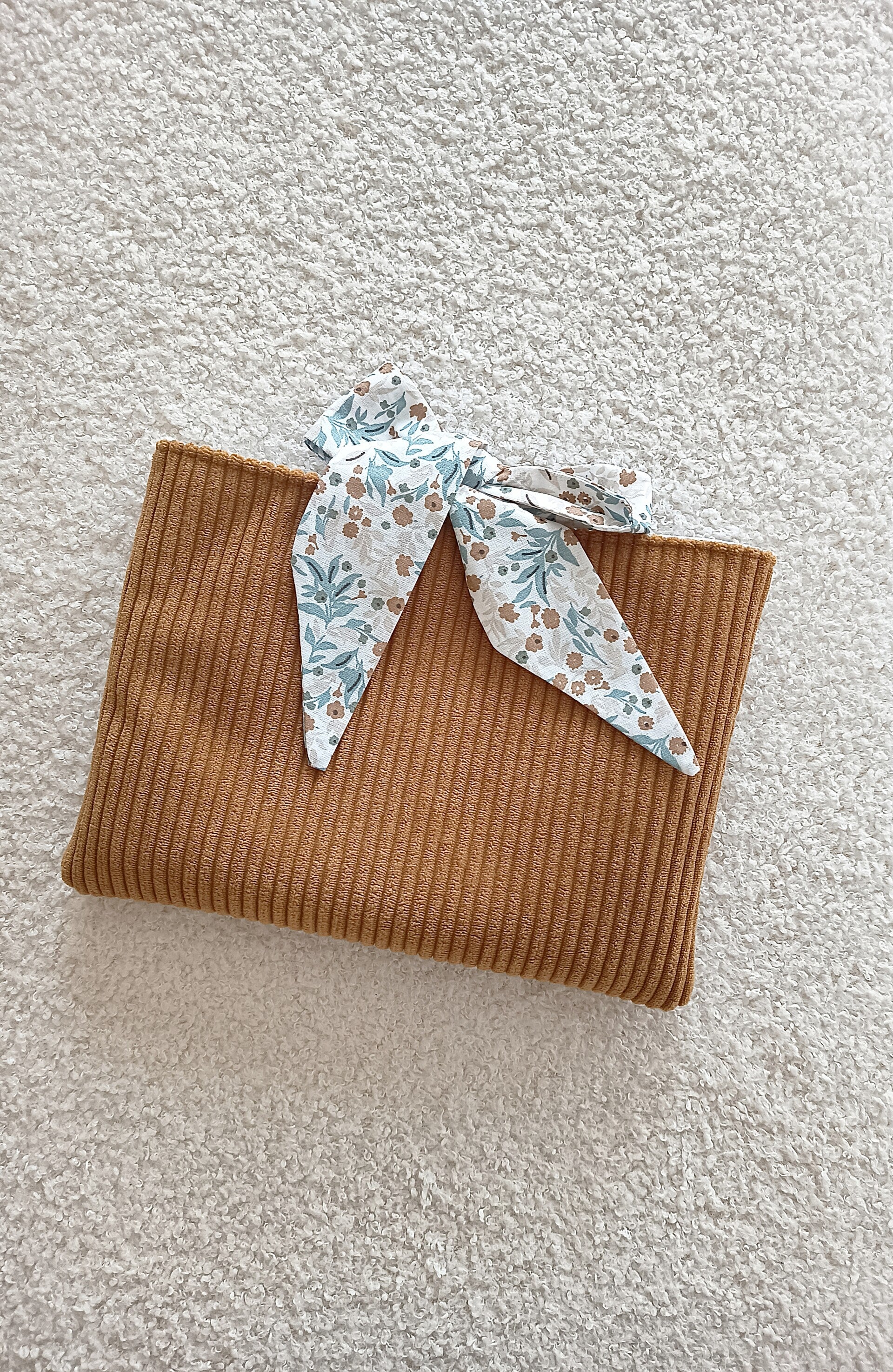 Cette pochette bi-matière associe un velours côtelé raffiné à un coton imprimé à l'intérieur. Elle est doublée de ouatine pour offrir une protection optimale à vos ouvrages.