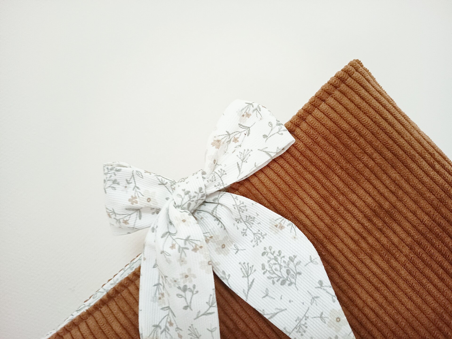 Cette pochette bi-matière associe un velours côtelé raffiné à un coton imprimé à l'intérieur. Elle est doublée de ouatine pour offrir une protection optimale à vos ouvrages.